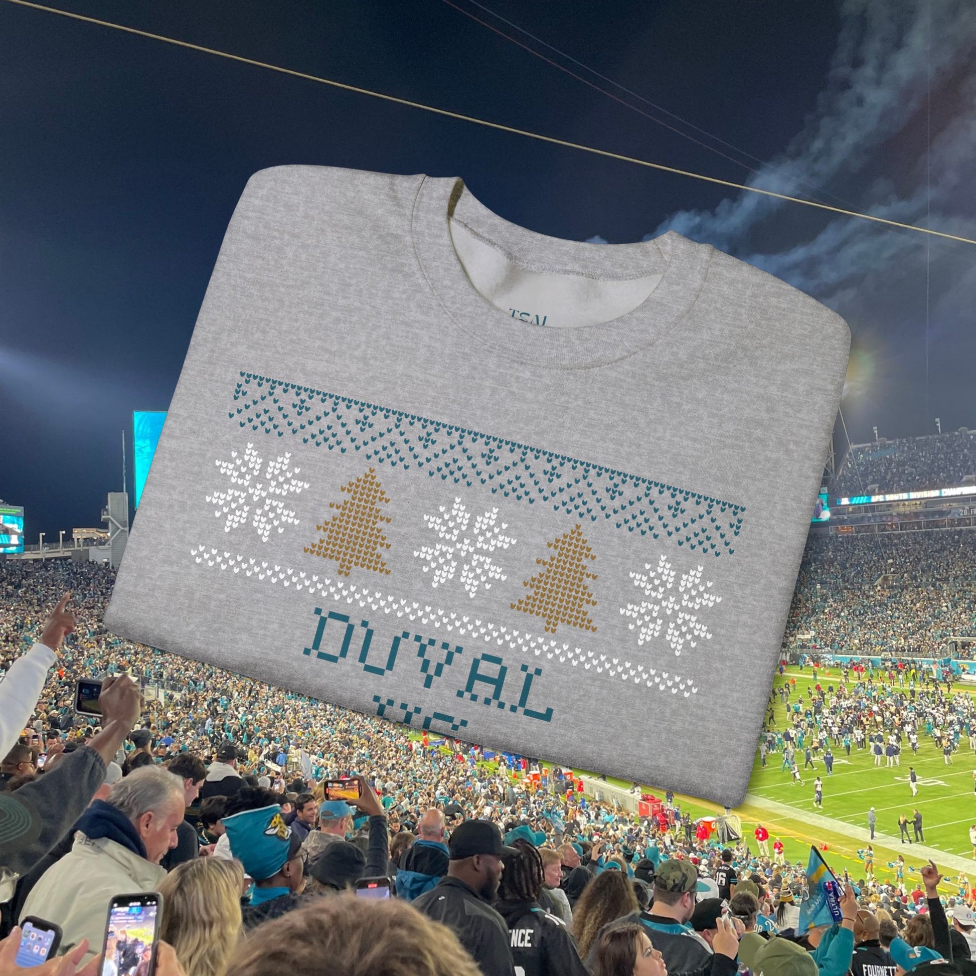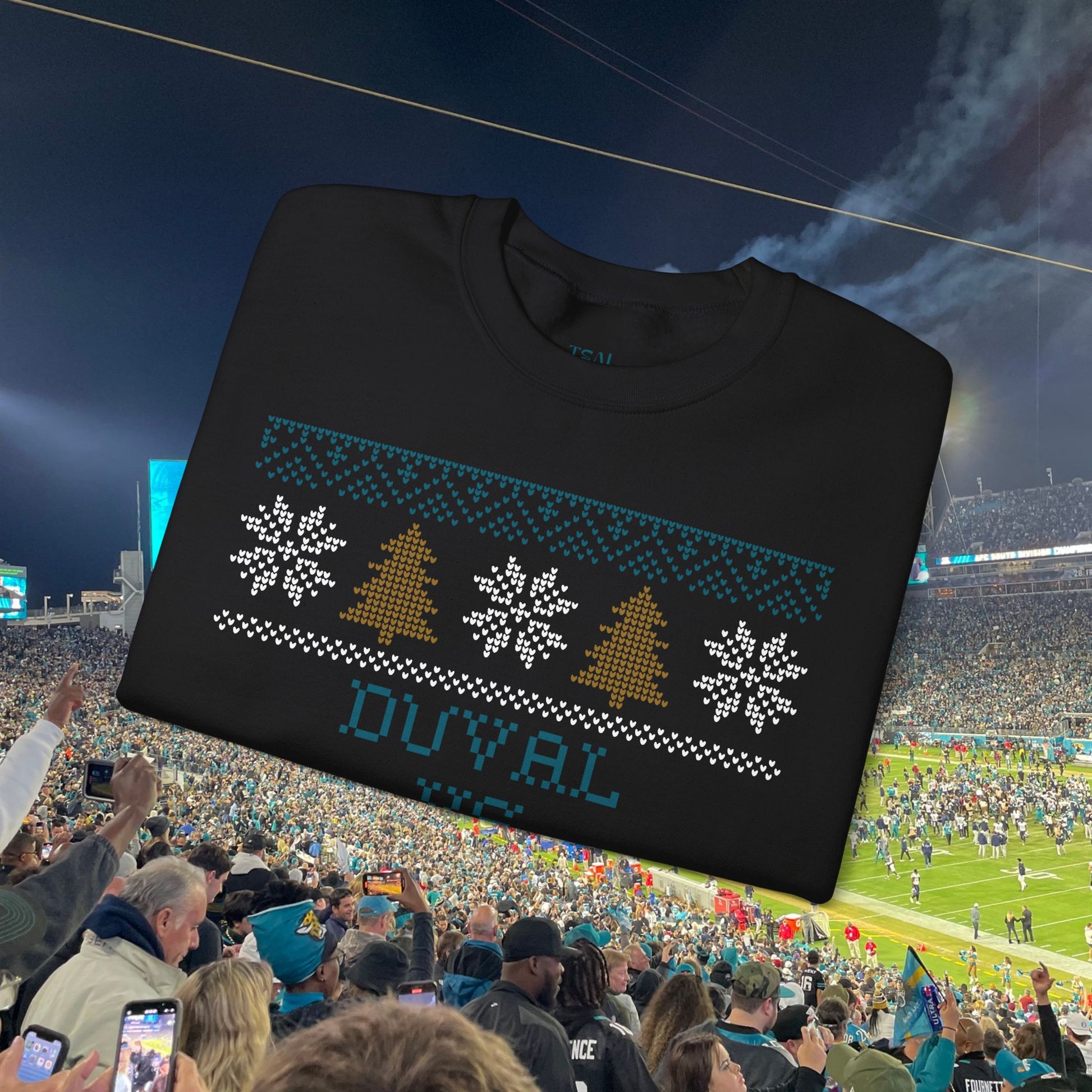 This Jacksonville fan favorite is back for another season! Embrace the festive spirit with this ugly Christmas sweater inspired Jaguars sweatshirt, perfect for tailgating, winter game days, and holiday parties. Designed for adult Jacksonville fans looking to show off their team spirit during the holiday season.
